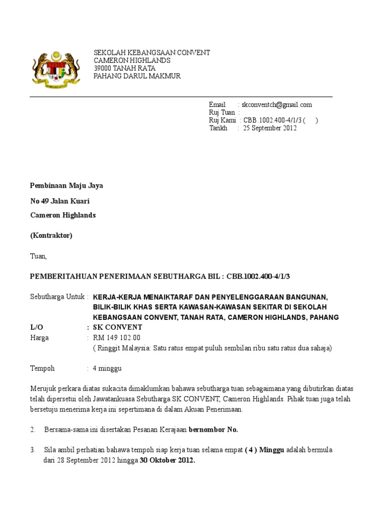 Pemberitahuan Penerimaan Sebutharga Kpd Kontraktor Yg Berjaya Pdf